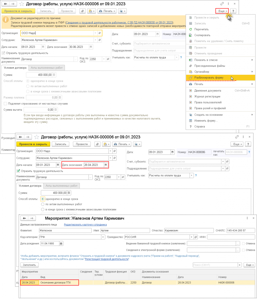 Если по договору ГПХ были переданы в СФР сведения о начале его действия, то в программе документ будет заблокирован (рис. 2). Если необходимо внести изменения в документ, например, в связи с досрочным расторжением договора, то: