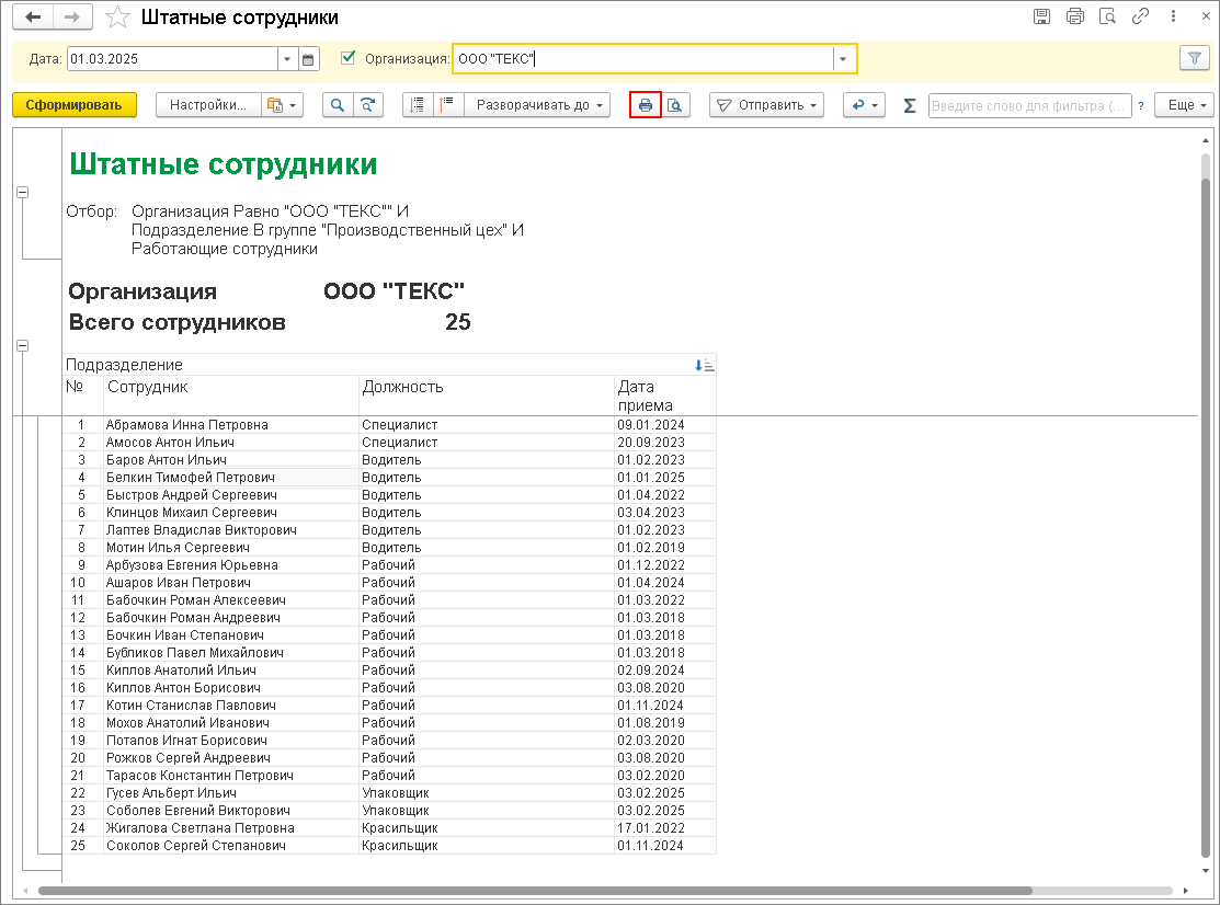В программе можно быстро получить список штатных сотрудников на конкретную дату — такой отчёт полезен при подготовке кадровых документов, проверке занятости или внутреннем учёте. Отчёт «Штатные сотрудники» формируется с учётом выбранной даты, организации и состава отображаемых данных (рис. 1).
